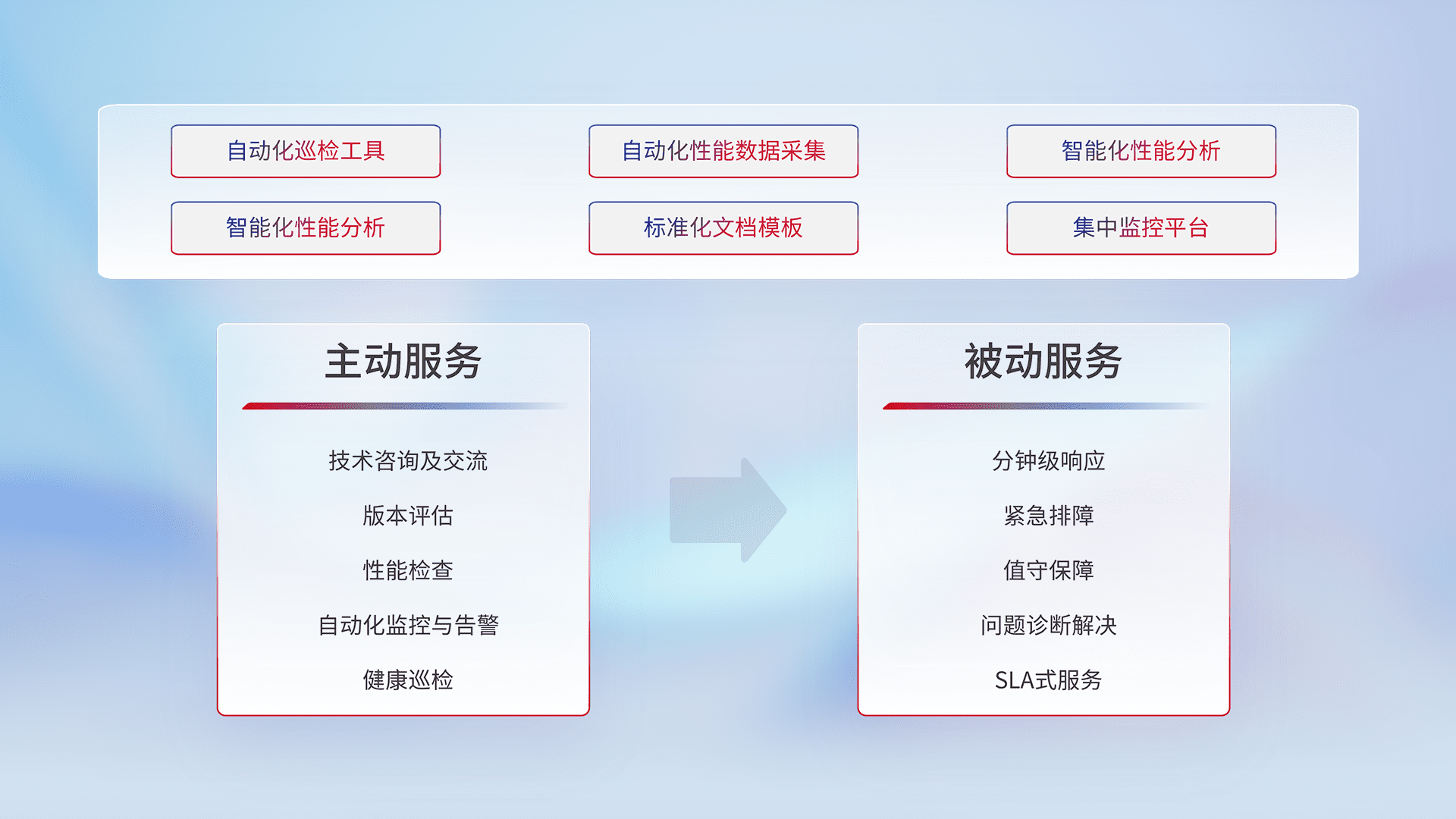 智能化工具和标准化文档,,,,保障服务质量,,提供主动服务(包含技术咨询、、、版本评估、、、、性能检查、、、、自动化监控与告警、、健康巡检)和被动服务包含(分钟级响应、、、紧急排障、、、、值守保障、、、问题诊断解决、、SLA服务)。。。